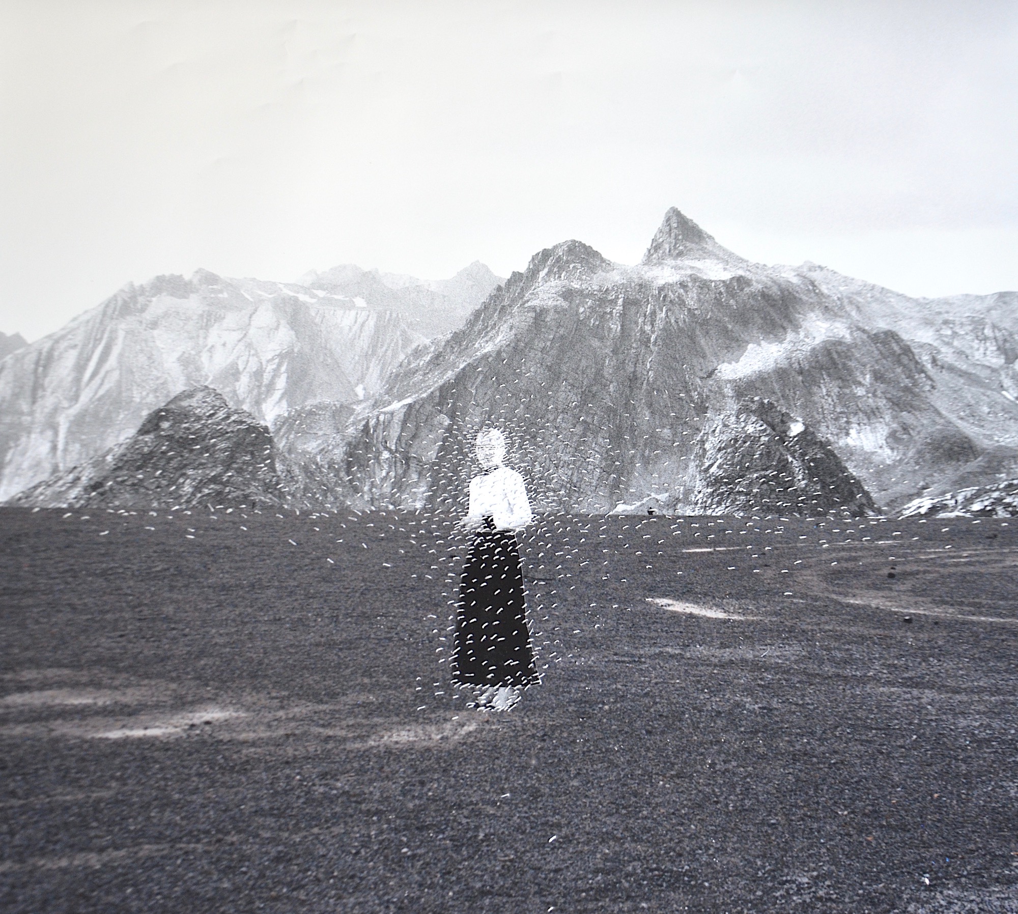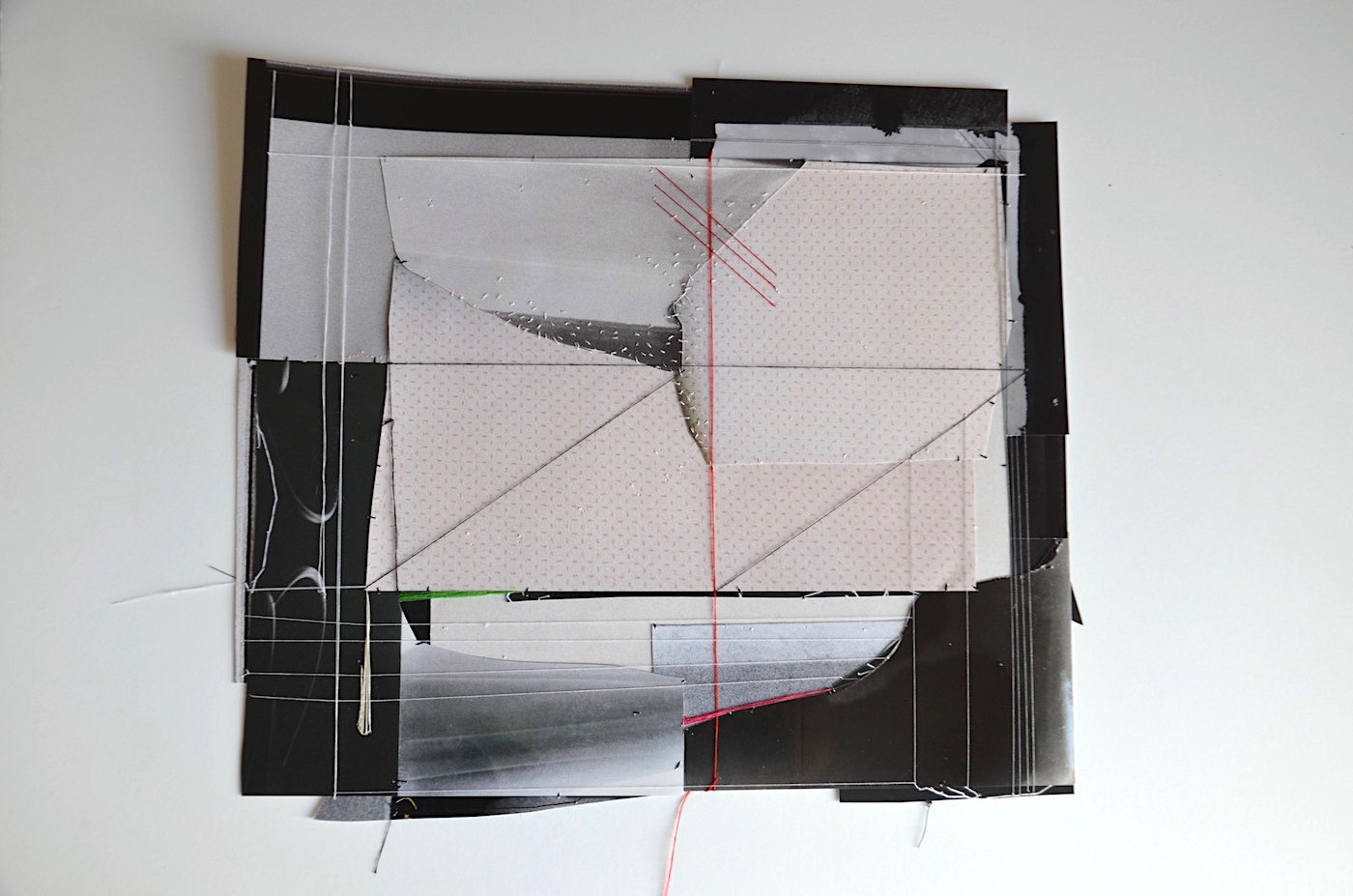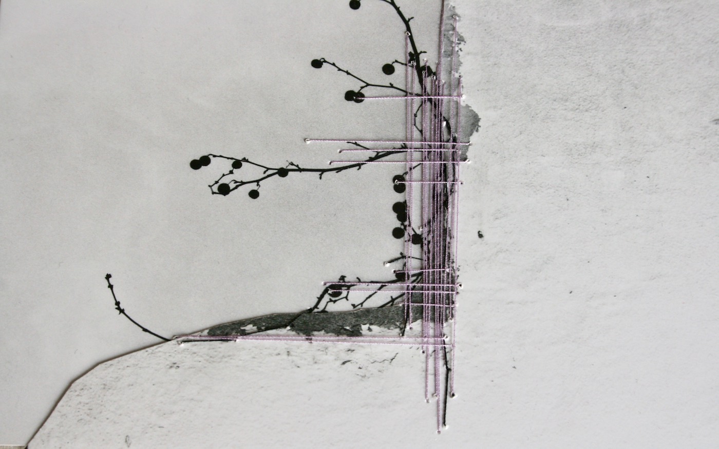 I create photo collages together with landscape photos. I draw with white straight lines, black lines or coloured lines, points and holes with thread and needle. By stitching and cutting the photographies I connected them to a new one. Like in a dream different aspects come together to a new surreal connection and composition.