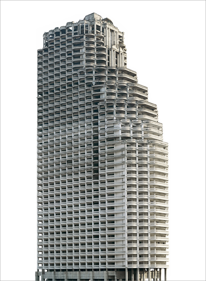 Babel is a multi-part project that deals with phenomena of today’s globalized cities. High-rise buildings in urban spaces usually symbolize power. Not accidentally, the biggest buildings are mostly owned by banks or big companies. But what we see in the series is rather the opposite: The buildings are huge and – at the first view – impressing, but all of them are incomplete. We have the impression to look at modern ruins, at unintentional sculptures of failure. And we are quite correct: The construction of all the buildings shown was prematurely terminated - in most cases during the Asian crisis in 1997. In traditional photography the relation between object and space is an important matter. In “Babel”, there is a way of reduction. The buildings are stripped off their descriptive space around them which leads to an irritation but at the same time towards an increased focus towards the sculptural elements of architecture. As a kind of ‘Towers of Babel’ the photographed buildings become an allegory of megalomania and a symbol of failure.