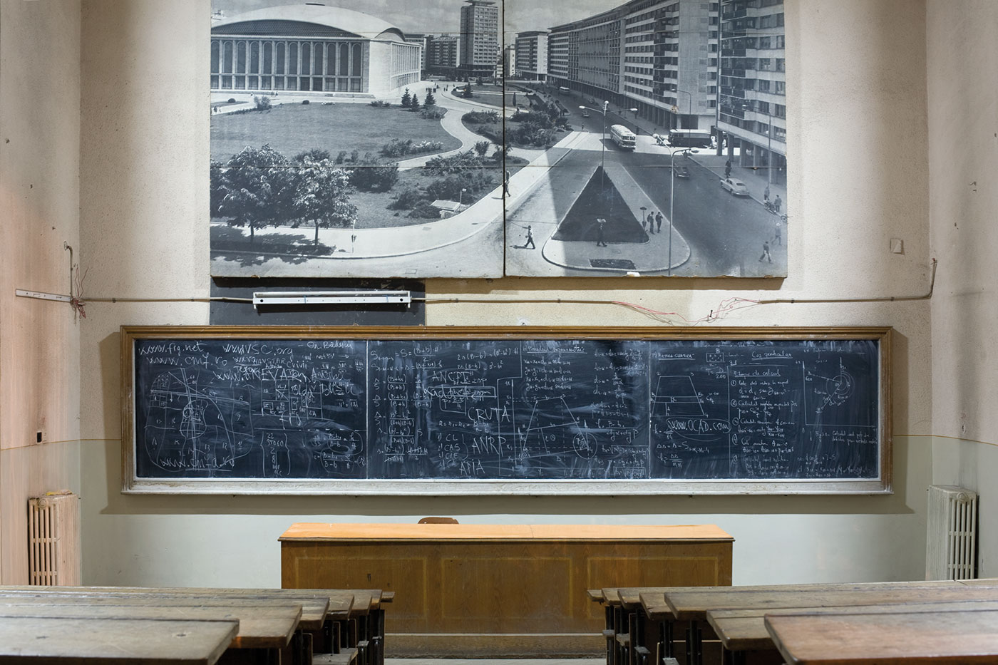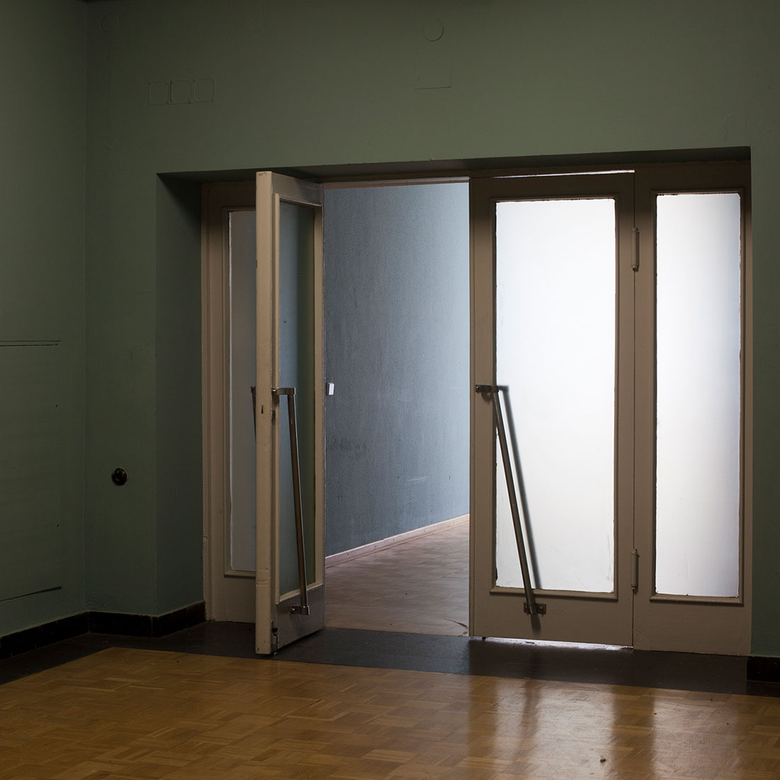 Flure, Treppenhäuser, Zwischenräume: Vertrautes und Fremdes. Lange Fluchten und mögliche Sackgassen: Die Fotografien dokumentieren kein vergangenes Geschehen, sie postulieren keine Zukunft, sie zeigen den Zustand, wenn sich alles in der Schwebe befindet.